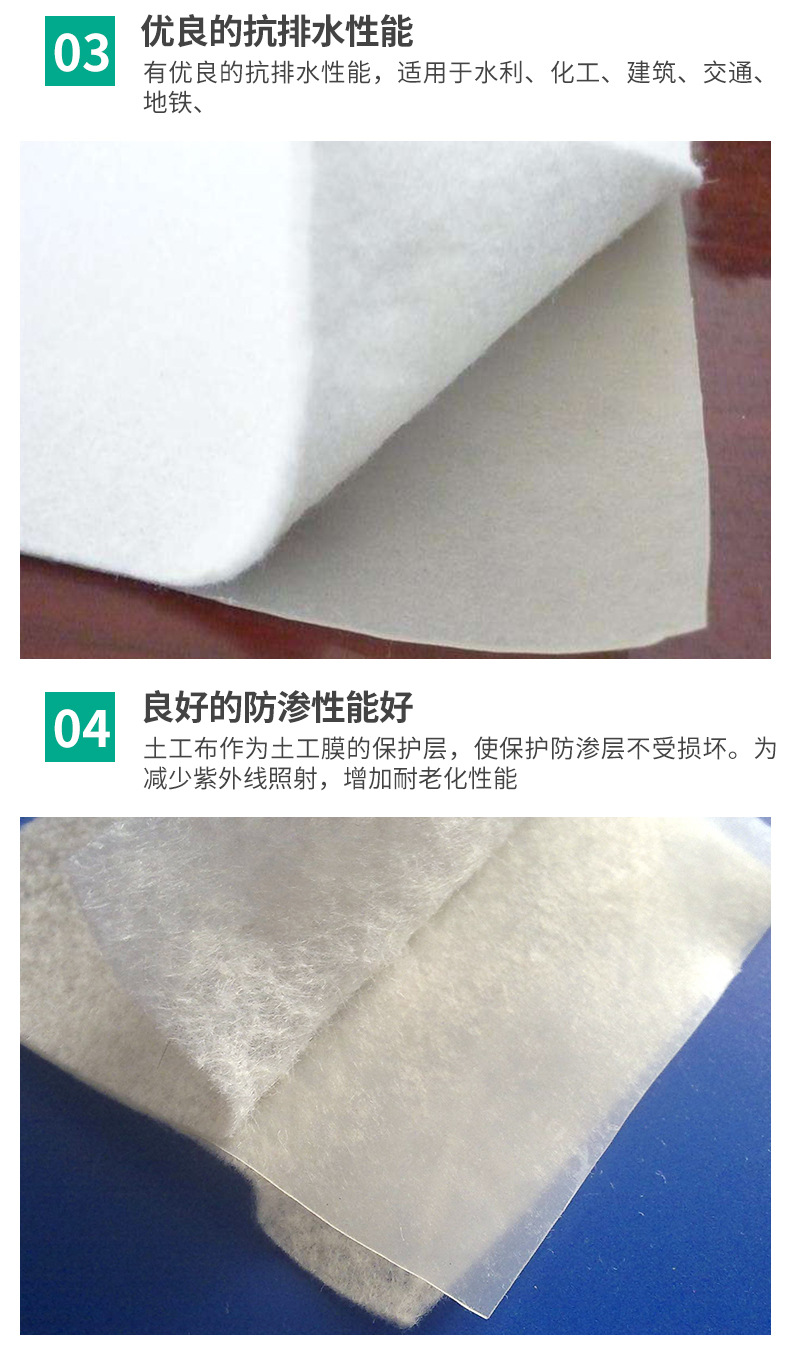產(chǎn)品介紹: 我們常說(shuō)的土工布即短絲土工布或短纖土工布,它是由合成纖維通過(guò)針刺或編織而成的透水性土工合成材料。成品為布狀。短絲土工布具有良好的力學(xué)功能,透水性好,并能